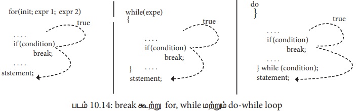 கீழே கொடுக்கப்பட்டுள்ள படம் ஓர் மடக்கில் break கூற்று இயங்கும் முறையை காட்டுகிறது.