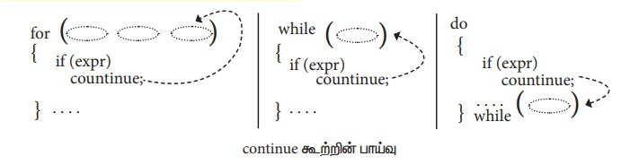 கீழே கொடுக்கப்பட்டுள்ள படம் continue கூற்று இயங்கும் முறையை விளக்குகிறது.