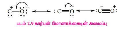 இது நேர்க்கோட்டு அமைப்பை பெற்றுள்ளது. கார்பன் மோனாக்சைடில், கார்பனுக்கும் ஆக்ஸிஜனுக்கும் இடையே மூன்று எலக்ட்ரான் இரட்டைகள் பங்கிடப்பட்டுள்ளன. XI வகுப்பில் கற்றறிந்தபடி மூலக்கூறு ஆர்பிட்டால் கொள்கையை பயன்படுத்தி கார்பன் மோனாக்சைடில் உள்ள பிணைப்பை விளக்க முடியும். C-O பிணைப்பு நீளம் 1.128A. பின்வரும் இரண்டு நியதி வடிவங்களின் உடனிசைவு வடிவமாக கருதப்படுகிறது.
