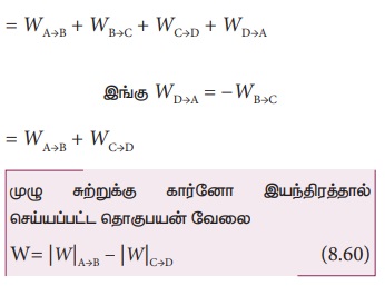 ஒரு முழு சுற்றுக்கு செயல்படு பொருளால் (நல்லியல்பு வாயு) செய்யப்பட்ட தொகுபயன் வேலை PV வரைபடத்தில் உள்ள ABCD என்ற மூடப்பட்ட வளைகோட்டினால் சூழப்பட்ட பரப்பிற்குச் சமம் என்பதை சமன்பாடு (8.60) காட்டுகிறது. இது படம் (8.48) இல் காட்டப்பட்டுள்ளது.