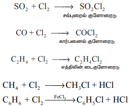 SO2 + C12 → SO2C12,(சல்புரைல் குளோரைடு)