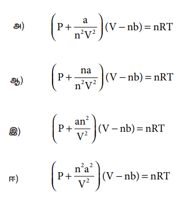 [விடை: இ) [ P + (an2/ V2)] (V − nb) = nRT]
