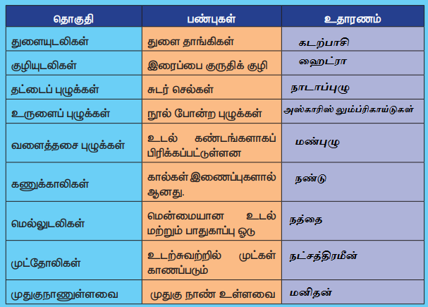 9. தொகுதி முட்தோலிகள் அல்லது எக்கைனோடெர்மேட்டா (எ.கா) நட்சத்திர மீன், கடல் சாமந்தி, நொறுங்குறு நட்சத்திரமீன், கடல் வெள்ளரி மற்றும் கடல் அல்லி