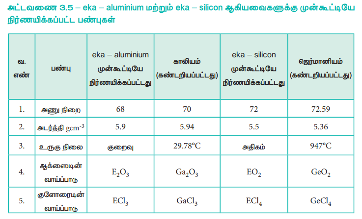 சரியான தனிமங்கள் கண்டறியப்பட்ட பின்னர், அவைகளின் பண்புகள், மெண்டலீஃப்பினால் முன் கூட்டியே நிர்ணயிக்கப்பட்ட பண்புகளுடன் ஏறத்தாழ ஒத்திருந்தன. (அட்டவணை 3.5)