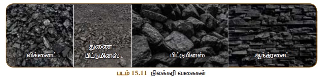 லிக்னைட், துணை பிட்டுமினஸ், பிட்டுமினஸ் மற்றும் ஆந்த்ரசைட். இந்த நான்கு வகைகளுள்