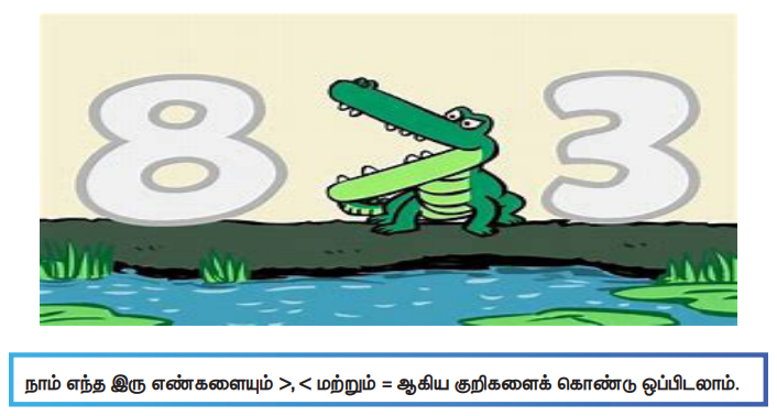 நாம் எந்த இரு எண்களையும் >, < மற்றும் = ஆகிய குறிகளைக் கொண்டு ஒப்பிடலாம்.