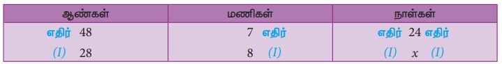 இங்கு , நாள்கள் (x) தெரியாதது ஆகும். இதனை ஆண்கள் மற்றும் மணிகளுடன் ஒப்பிட வேண்டும்