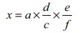 இங்கு, ஆண்கள் கலத்தில் தெரியாதது (x) உள்ளது. ஆகவே, அதை தெரிந்த மணிகள் மற்றும் நாள்கள் கலத்துடன் ஒப்பிட வேண்டும். இங்கு, ஆண்கள் மற்றும் மணிகள் நேர் விகிதத்தில் (D) இருந்தால், பெருக்கல் காரணியாக d/c ஐ எடுத்துக் கொள்ள வேண்டும் (தலைகீழியை எடுக்க வேண்டும்). மேலும், ஆண்கள் மற்றும் நாள்கள் எதிர் விகிதத்தில் (I ) இருந்தால், பெருக்கல் காரணியாக e/f ஐ எடுத்துக் கொள்ள வேண்டும் (மாற்றமில்லை). இவ்வாறாக, நாம் தெரியாத (x) ஆண்களை