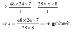 48 ஆண்கள் ஒரு வேலையை நாளொன்றுக்கு 7 மணி நேரம் வேலை செய்து 24 நாள்களில் முடிப்பர் எனில், 28 ஆண்கள் அதே வேலையை நாளொன்றுக்கு 8 மணி நேரம் வேலை செய்து எத்தனை நாள்களில் முடிப்பர்?