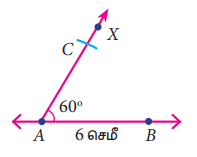 படி 3: A ஐ மையமாகக் கொண்டு 5 செ.மீ ஆரம் கொண்ட வட்ட வில்லைக் கதிர் AX ஐ வெட்டுமாறு வரைக. வெட்டும் புள்ளியை C எனக் குறிக்க.