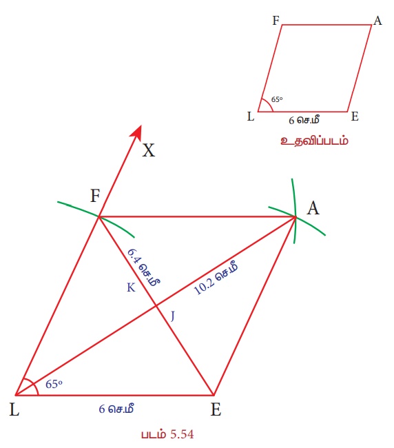 LE = 6 செ.மீ மற்றும் ∠L = 65° அளவுகள் கொண்ட LEAF என்ற சாய்சதுரம் வரைந்து அதன் பரப்பளவைக் காண்க