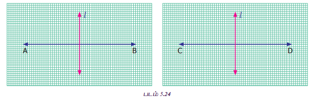 படம் 5.24 இல் சில செங்குத்துக் கோடுகள் உள்ளன. இரு வகைகளிலும் செங்குத்துக்கோடு l ஆனது கோட்டுத்துண்டினை இரு சமபாகங்களாகப் பிரிக்கின்றது. இந்த l என்ற கோடானது கொடுக்கப்பட்ட கோட்டுத்துண்டின் செங்குத்து இரு சமவெட்டி எனப்படும். ஆகவே, ஒரு கோட்டுத்துண்டினை இருசமபாகங்களாகப் பிரிக்கும் செங்குத்துக்கோடானது, அக்கோட்டுத்துண்டின் செங்குத்து இரு சமவெட்டி எனப்படும்.