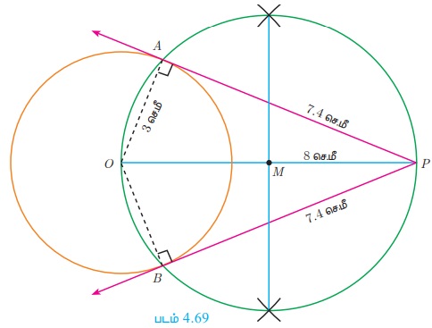 படி 5: AP மற்றும் BP யை இணைக்கவும். AP மற்றும் BP தேவையான தொடுகோடுகள் ஆகும். தொடுகோட்டின் நீளம் PA = PB = 7.4 செ.மீ.