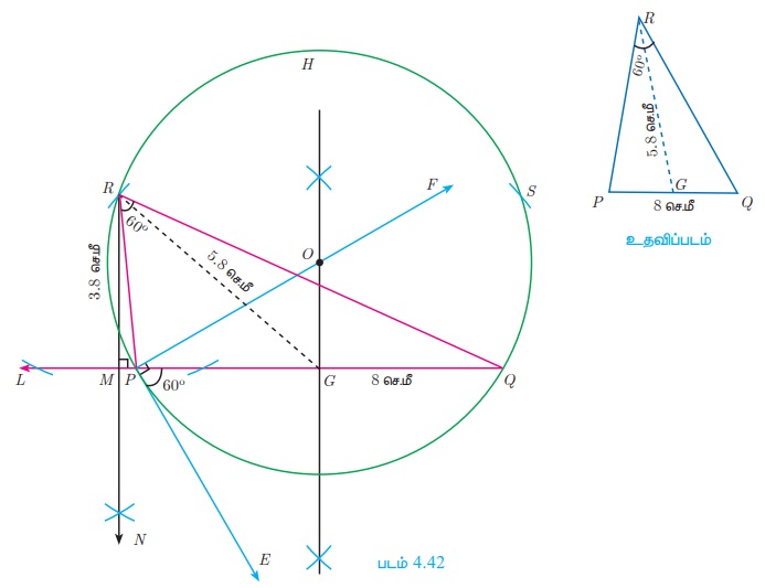 PQ = 8 செ.மீ, ∠R = 60° உச்சி R-லிருந்து PQ-க்கு வரையப்பட்ட நடுக்கோட்டின் நீளம் RG = 5.8 செ.மீ. என இருக்குமாறு ΔPQR வரைக. R-லிருந்து PQ-க்கு வரையப்பட்ட குத்துக் கோட்டின் நீளம் காண்க.
