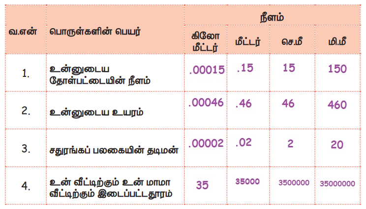 கீழ்க்கண்டவற்றை அளவு நாடா மற்றும் அளவுகோல் கொண்டு அளந்து எழுதுக.