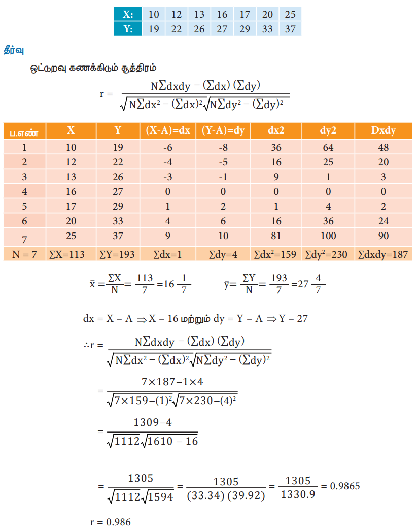 உதாரணம் 1 : பின்வரும் விவரங்களுக்கு உண்மைச் சராசரியை பயன்படுத்தும் சூத்திரத்தினை பயன்படுத்தி கார்ல் பியர்ஸனின் ஒட்டுறவுக் கெழுவினை கண்டறிக
