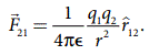 இங்கு r^21 என்பது q2 விலிருந்து q1 ஐ நோக்கிய திசையிலுள்ள ஓரலகு வெக்டராகும். ஆனால், r^12 = -r^21 எனப் பிரதியிட்டால்,