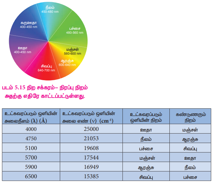 பெரும்பாலான இடைநிலை உலோக அணைவுச் நீலம் சேர்மங்கள் நிறமுடையவைகளாக உள்ளன. ஒரு சேர்மம் கண்ணுறு ஒளியில் ஒரு குறிப்பிட்ட அலை நீளத்தை உட்கவர்ந்து கண்ணுறு ஒளியின் பிற பகுதிகளை பிரதிப்பலிக்கிறது. பிரதிபலிக்கப்படும் இந்த ஒளி நமது கண்ணில்படும்போது, நமது மூளை அதன் நிறத்தினை மீட்டறிகிறது. பிரதிபலிக்கப்படும் ஒளியானது உட்கவரப்படும் ஒளியின் நிரப்பு நிறமாகும். எடுத்துக்காட்டாக, நீரேற்றமடைந்த காப்பர் (II) அயனியானது நீல நிறத்தில் உள்ளது. இது ஆரஞ்சு நிற ஒளியினை உட்கவர்ந்து அதன் நிரப்ப நிறமான(Complementary colour) நீல நிற ஒளியை பிரதிபலிக்கிறது. உட்கவரப்படும் மற்றும் அதன் நிரப்பு நிறம் கீழ்க்கண்டுள்ள அட்டவணையில் தரப்பட்டுள்ளது.