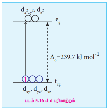 ஒளி உட்கவரப்படுவதால் மைய உலோக அயனியின் d-எலக்ட்ரான்கள் குறைவான ஆற்றலுடைய t2g நிலையிலிருந்து அதிக ஆற்றலுடைய eg நிலைக்கு கிளர்வுறுகின்றன. இது d-d பரிமாற்றம் எனப்படுகிறது. d-d பரிமாற்றத்தினை [Ti(Hg2O)6]3+ அணைவினை உதாரணமாகக் கொண்டு நாம் புரிந்து கொள்வோம்.