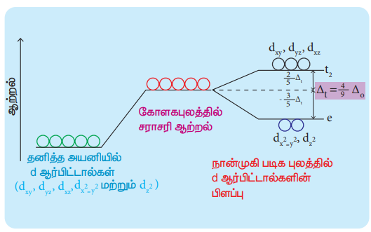 இதன் விளைவாக, படம் 5.3ல் காட்டியுள்ளவாறு t2 ஆர்பிட்டால்களின் ஆற்றலானது 2/5∆t என்ற அளவில் அதிகரிக்கின்றது. மேலும் 8 ஆர்பிட்டால்களின் ஆற்றல் 3/5∆t என்ற அளவில் குறைகிறது. எண்முகி படிக புலத்தோடு ஒப்பிடும் போது, இப்புலத்தில் படிகபுலப் பிளப்பானது தலைகீழ் மாற்றமடைந்தும், மேலும் பிளப்பு ஆற்றலின் அளவு குறைவாகவும் உள்ளது. எண்முகி மற்றும் நான்முகி படிகப்புலங்களில், படிக புலப் பிளப்பு ஆற்றல்களுக்கு இடையேயானத் தொடர்பு பின்வரும் சமன்பாட்டால் தரப்படுகிறது. ∆t = 4/9∆o