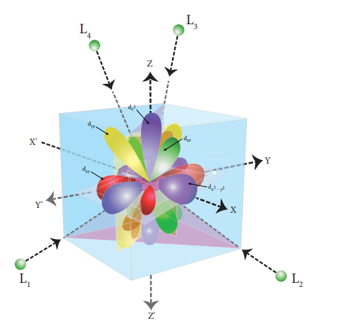 இப்புலத்தில், எந்த ஒரு d ஆர்பிட்டாலும் ஈனிகள் அணுகும் திசையிலேயே அமைவதில்லை . எனினும், e ஆர்பிட்டால்களைக் (dx2_y2 மற்றும் dz2) காட்டிலும் t2 ஆர்பிட்டால்கள் (dxy , dyx மற்றும் dzx ஆகியன ), ஈனிகள் அணுகும் திசைக்கு அருகாமையில் அமைந்துள்ளன.