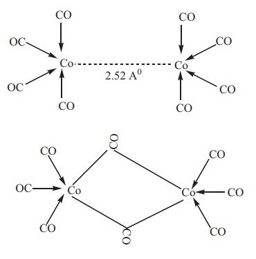 (ii) டைகோபால்ட்ஆக்டாகார்பனைலில் Co2(CO)8 இரு மாற்றியங்கள் உருவாக வாய்ப்புள்ளன. அவற்றினுள் ஒன்றில், கோபால்ட் அணுக்களுக்கிடையே உலோக-உலோக பிணைப்பு காணப்படுகிறது. மற்றொன்றில், இரு இணைப்பு பால CO ஈனிகள் காணப்படுகின்றன.