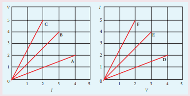 1. பின்வரும் வரைபடங்கள் A, B, C, D, E மற்றும் F ஆகிய ஆறு கடத்திகளின் மின்னோட்டம் − மின்னழுத்தம் மற்றும் மின்னழுத்தம் − மின்னோட்டம் ஆகியவற்றின் தொடர்பினை தருகின்றன எனில், அதிக மின்தடை உள்ள கடத்தி மற்றும் குறைந்த மின்தடை உள்ள கடத்திகள் எவை?