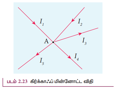 • எந்த ஒரு சந்தியிலும் சந்திக்கின்ற மின்னோட்டங்களின் குறியியல் கூட்டுத்தொகை [Algebraic Sum] சுழியாகும்.