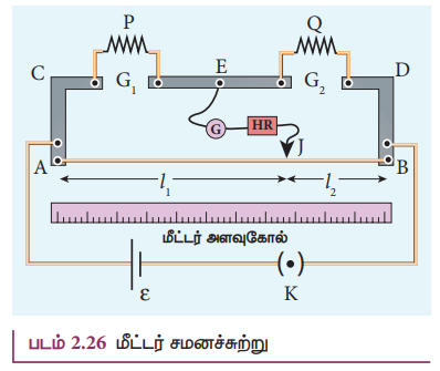 • இரண்டாவது மின்கலம் ξ2 மின்சுற்றில் இணைக்கப்பட்டு சமன்செய் நீளம் l2 கண்டறியப்படுகிறது.