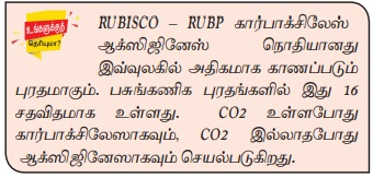 RUBISCO - RUBP கார்பாக்சிலேஸ் ஆக்ஸிஜினேஸ் நொதியானது இவ்வுலகில் அதிகமாக காணப்படும் புரதமாகும். பசுங்கணிக புரதங்களில் இது 16 சதவிதமாக உள்ளது. CO2 உள்ளபோது கார்பாக்சிலேஸாகவும், CO2 இல்லாதபோது ஆக்ஸிஜினேஸாகவும் செயல்படுகிறது.