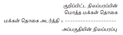 மக்கள் தொகை அடர்த்தி = மொத்த மக்கள் தொகை / அப்பகுதியின் நிலப்பரப்பு