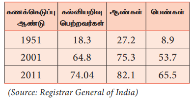 இது மொத்த மக்கள் தொகையில் எழுத்தறிவு பெற்றவர்கள் எண்ணிக்கை விகிதத்தை குறிப்பிடுகிறது. 1951 ஆம் ஆண்டில் ஆண்களில் நான்கில் ஒருவர் மற்றும் பெண்களில் பன்னிரெண்டில் ஒருவர் என்ற அளவிலேயே எழுத்தறிவு பெற்றோர் எண்ணிக்கை இருந்தது. சராசரியாக ஆறு பேருக்கு ஒருவர் மட்டுமே எழுத்தறிவு பெற்றவர் ஆவார். 2011ல் ஆண்கள் 82% மற்றும் பெண்கள் 65.5% என்ற அளவில் ஒட்டு மொத்த எழுத்தறிவு விகிதம் 74.04% ஆகும். இது மற்ற வளர்ந்த நாடுகள் மற்றும் இலங்கையைக் காட்டிலும் கூட மிகவும் குறைவு.