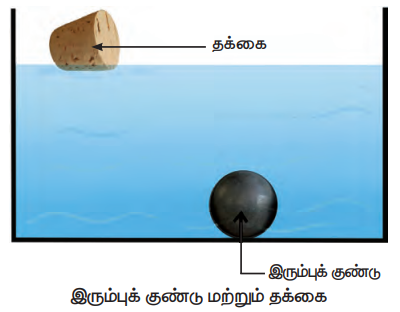 ஒரு முகவையில் நீரை எடுத்துக் கொண்டு, அதில் ஓர் இரும்புக் குண்டையும் ஒரு தக்கையையும் போடவும். என்ன காண்கிறாய்? படத்தில் காட்டியுள்ளபடி இரும்புக் குண்டு மூழ்குகிறது, தக்கை மிதக்கிறது. இது ஏன் என விளக்கமுடியுமா?