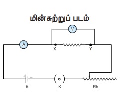 * மின்சுற்றுப் படத்தில் காட்டியுள்ளபடி மின்கலம், அம்மீட்டர், கம்பிச் சுருள், மின்தடை மாற்றி மற்றும் சாவி ஆகியவற்றை மின் இணைப்புக் கம்பியைப் பயன்படுத்தி தொடராக இணைக்கவும்.