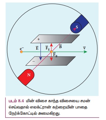 படம் 8.4இல் கொடுத்துள்ளவாறு, மின் விசையின் அளவினை காந்த விசையின் அளவு சமன் செய்கிறது.