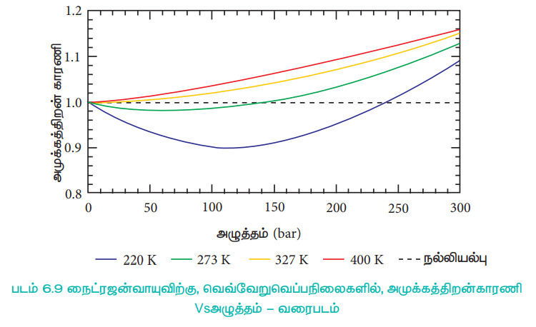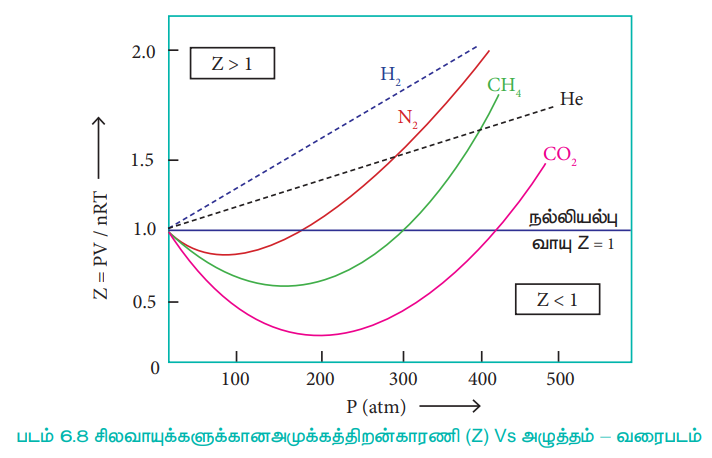நல்லியில்பு வாயுக்களுக்கு PV = nRT எனவே, அனைத்து வெப்ப அழுத்த நிலைகளிலும் அமுக்கத்திறன் காரணி, Z = 1, இவ்வாயுக்களுக்கான Z Vs P வரைபடமானது அழுத்த அச்சிற்கு இணையான நேர்கோடாக அமையும். வாயுக்கள் நல்லியல்புத் தன்மையிலிருந்து விலகலடையும் போது, Zன் மதிப்பானது ஒன்றிலிருந்து விலகலடைகிறது. அனைத்து வாயுக்களுக்கும், மிகக்குறைந்த அழுத்தம் மற்றும் மிக அதிக வெப்பநிலைகளில் அமுக்கத்திறன் காரணியின் மதிப்பு 1க்கு அருகில் அமைந்துள்ளது. மேலும் வாயுக்கள் நல்லியல்புத் தன்மையுடையதாக செயல்படுகின்றன. குறிப்பிட்ட சிலவாயுக்களுக்கான அமுக்கத்திறன் காரணி Vs அழுத்த வரைபடமானது வரைபடம் 6.8ல் காட்டப்பட்டுள்ளது.