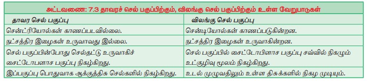 அட்டவணை: 7.3 தாவரச் செல் பகுப்பிற்கும், விலங்கு செல் பகுப்பிற்கும் உள்ள வேறுபாடுகள்