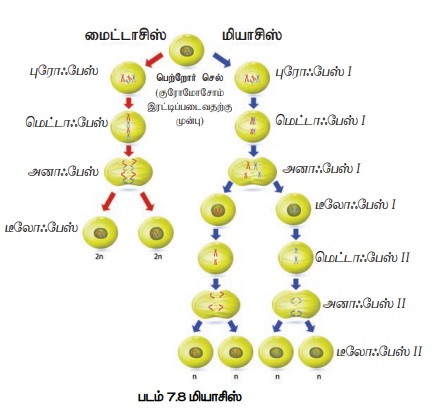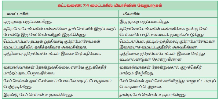 அட்டவணை: 7.4 மைட்டாசிஸ், மியாசிஸின் வேறுபாடுகள்