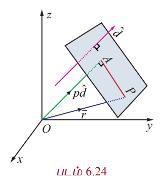 • தளத்திற்குச் செங்குத்தான ஓரலகு வெக்டர் மற்றும் ஆதிப்புள்ளியில் இருந்து அத்தளத்திற்கு உள்ள தூரம்.
