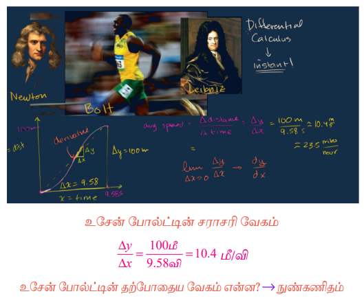 இப்பாடப்பகுதியில் வகைக்கெழுக் கருத்தியலைப் பற்றியும், அதன் தொடர்பான இதர கருத்துகளையும் ஆராய்வதன் மூலம் அன்றாட வாழ்க்கையில் சந்திக்கும் சவால்களுக்குத் தீர்வுக் காண இயலும். இதன் தொடர்ச்சியாக திசைவேகத்தின் சராசரியைக் கீழ்க்காணும் உதாரணத்தின் மூலம் காண்போம்.