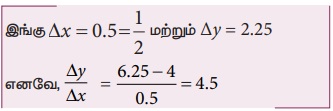 x1 = 2 மற்றும் x2 = 2.5 எனில் y1 = 4 மற்றும் y2 = (2.5)2 = 6.25 எனக் கிடைக்கும்