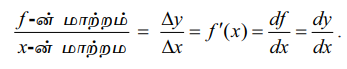 f-ன் மாற்றம் / x-ன் மாற்றம் = ∆y/∆x = f’(x) = df/dx = dy/dx.