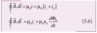 இங்கு பரப்பினால் சூழப்பட்ட மொத்த மின்னோட்டமானது கடத்து மின்னோட்டம் மற்றும் இடப்பெயர்ச்சி மின்னோட்டம் ஆகியவற்றின் கூடுதல் ஆகும். அதாவது, i = ic + idசமன்பாடு (5.6) ஆம்பியர் - மேக்ஸ்வெல் விதி எனப்படுகிறது. மின்சுற்றில் மின்னோட்டம் மாறாமல் உள்ள போது, இடப்பெயர்ச்சி மின்னோட்டம் சுழியாகும்.