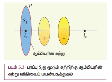 இப்போது அதே சுற்று பலூன் வடிவம் கொண்ட பரப்பு S2வினால் மூடப்பட்டுள்ளது (படம் 5.4). அதாவது S1 மற்றும் S2 இரண்டு பரப்புகளின் எல்லைகளுமே ஒன்றாக இருந்தாலும், அப்பரப்புகளின் வடிவம் வெவ்வேறாக உள்ளது. ஒரு மூடப்பட்ட சுற்றுக்கு ஆம்பியர் விதியைப் பயன்படுத்தும்போது, அது சூழும் பரப்பினுடைய வடிவத்தைப் பொறுத்து அமையாது என்பதால் இரு தொகையீடுகளும் ஒரே மதிப்பைத் தர வேண்டும். ஆனால் பரப்பு S2க்கு ஆம்பியரின் சுற்று விதியைப் பயன்படுத்தினால்,
