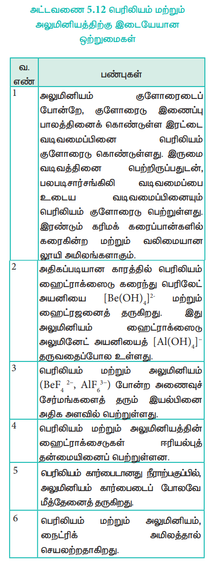 அட்டவணை 5.12 பெரிலியம் மற்றும் அலுமினியத்திற்கு இடையேயான ஒற்றுமைகள்