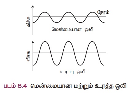 குறைந்த வீச்சுடைய ஒலியானது உண்டாகிறது. மேசையை வேகமாக அடிக்கும் போது உரத்த ஒலி கேட்கிறது. அதிக செறிவுடைய ஒலியானது அதிக ஆற்றலைப் பெற்றிருப்பதால் அது அதிக தூரம் செல்ல முடியும். ஒலியானது அதன் மூலத்திலிருந்து விரிந்து கொண்டே செல்வதால் அதன் வீச்சு குறைந்து கொண்டே செல்லும். ஒரே அதிர்வெண் கொண்ட மென்மையான மற்றும் உரத்த ஒலி அலையின் வடிவத்தை படம் 2.5 குறிக்கிறது.