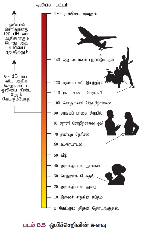 ஓரிடத்தில் கேட்கும் ஒலியின் செறிவானது கீழ்க்கண்ட காரணிகளைச் சார்ந்திருக்கும்.