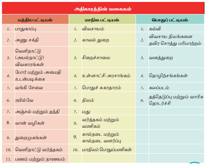 இந்திய அரசமைப்பின் ஏழாவது அட்டவணையில், மத்திய மற்றும் மாநிலங்களின் சட்டரீதியான அதிகாரங்களும் செயல்பாடுகளும் தெளிவாக வரையறுக்கப்பட்டுள்ளன. இதில் மத்திய மற்றும் மாநில அரசுகள் சட்டம் இயற்றுவதற்கான அதிகாரங்கள் தெளிவாக வரையறுக்கப்பட்டுள்ளது. இந்த அதிகாரங்கள் மூன்றாக வகுக்கப்பட்டுள்ளன.