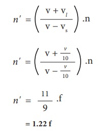 ஒலி மூலத்தின் அதிர்வெண் 'n' எனவும், கேட்குநரால் உணரப்படும் ஒலியின் அதிர்வெண் n' எனவும்