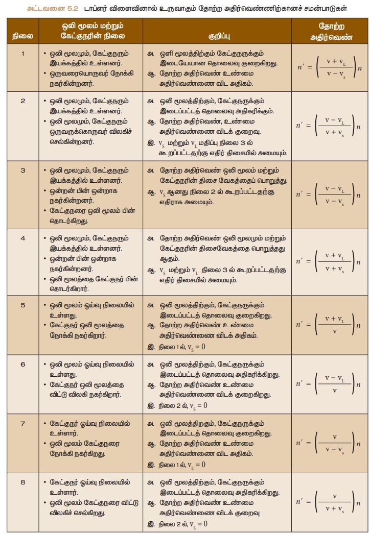 நிபந்தனைகள், பயன்பாடுகள், தீர்க்கப்பட்ட எடுத்துக்காட்டு கணக்கீடுகள் - டாப்ளர் விளைவு | 10th Science : Chapter 5 : Acoustics